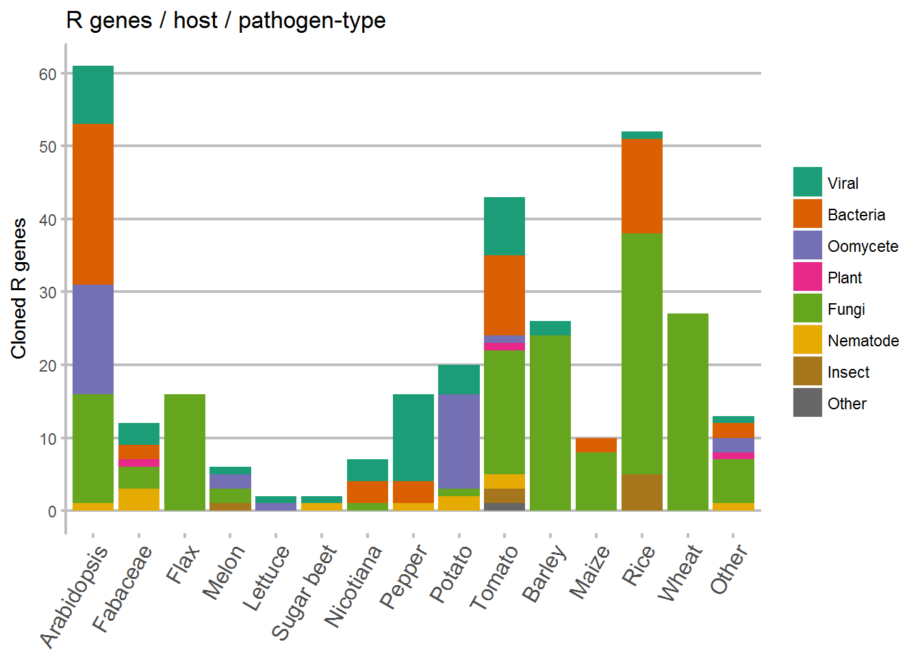Again we grouped the same species together as before, and then plot the type of pathogen against which a cloned R gene is present against the host plant. From this data we can see either research bias for certain pathosystems, or a reflection of actual pathogen pressure (or both).